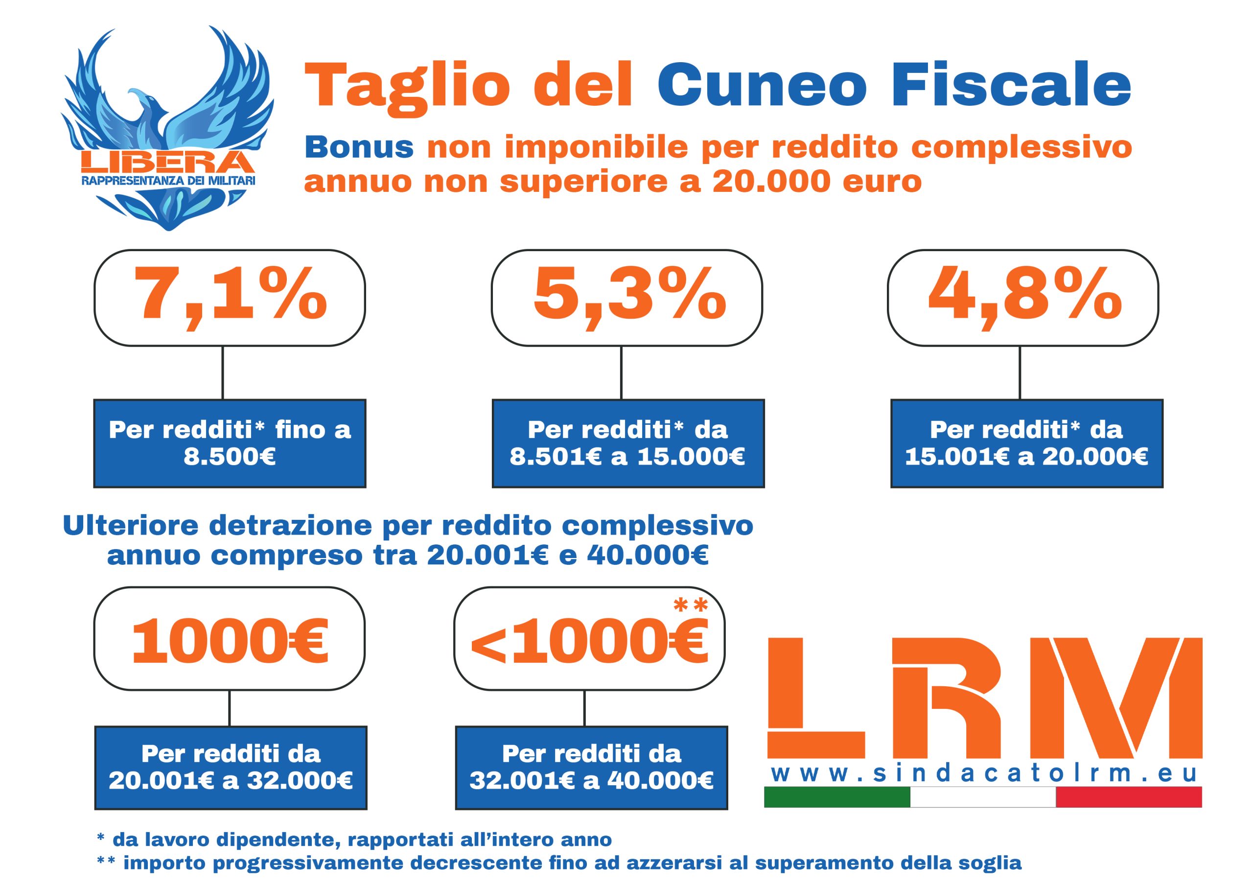 Libera Rappresentanza dei Militari informa tutti i colleghi sull’applicazione delle misure previste dalla Legge di Bilancio 2025. A partire dal mese di giugno, NoiPA applicherà in busta paga le misure relative al taglio del cuneo fiscale, cioè la riduzione delle tasse sul lavoro. Questo si tradurrà in un aumento netto dello stipendio mensile. Inoltre, saranno riconosciuti anche i benefici arretrati spettanti da gennaio a maggio 2025. Le misure si applicano in base al reddito complessivo annuo del lavoratore: per chi guadagna fino a 20.000 euro l’anno è previsto un bonus integrativo (esentasse), calcolato in percentuale: 7,1% per redditi fino a 8.500 euro, 5,3% per redditi tra 8.501 e 15.000 euro, 4,8% per redditi tra 15.001 e 20.000 euro. Per chi guadagna tra 20.001 e 40.000 euro, è prevista una nuova detrazione fiscale: 1.000 euro annui per redditi tra 20.001 e 32.000 euro e una detrazione decrescente fino ad azzerarsi per redditi tra 32.001 e 40.000 euro. NoiPA calcolerà automaticamente l’importo spettante per ogni dipendente, stimando il reddito annuo complessivo (sommando i redditi già percepiti nei primi 5 mesi con una proiezione per i successivi 7 mesi, compresa la tredicesima). Se il sistema rileva che il reddito previsto nel 2025 è più basso rispetto a quello del 2024, allora verrà preso come riferimento il reddito 2024. Questo per evitare che vengano esclusi compensi accessori o indennità non ancora corrisposti nel 2025. Chi sa già che supererà i limiti di reddito (es. per altri redditi o attività non conosciute da NoiPA) potrà rinunciare al bonus per evitare di doverlo restituire a fine anno. È stata attivata un’apposita funzione nell’Area Riservata di NoiPA, con cui è possibile rinunciare al beneficio in autonomia.